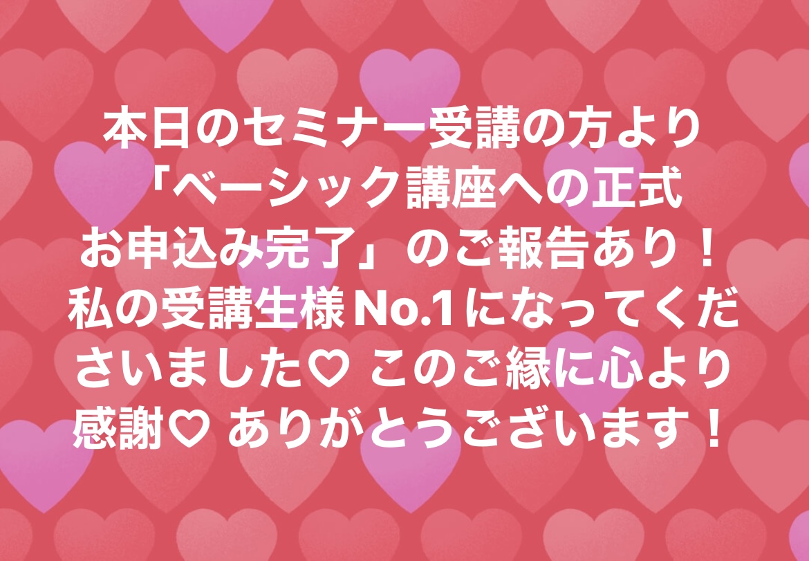 受講生様第1号♪ 2023 3/06 ブログ 2023年3月6日 本日のセミナー受講生様が、本講座にお申込みをしてくださいました! 私の受講生様 第1号になってくださったんです ご縁に感謝!本当にありがとうございます。 誠心誠意、このセルコンメソッドをお伝えさせていただきますね♪ ブログ よかったらシェアしてね! URLをコピーしました! URLをコピーしました! 1Dayセミナー開催しました 10年ぶりの再会